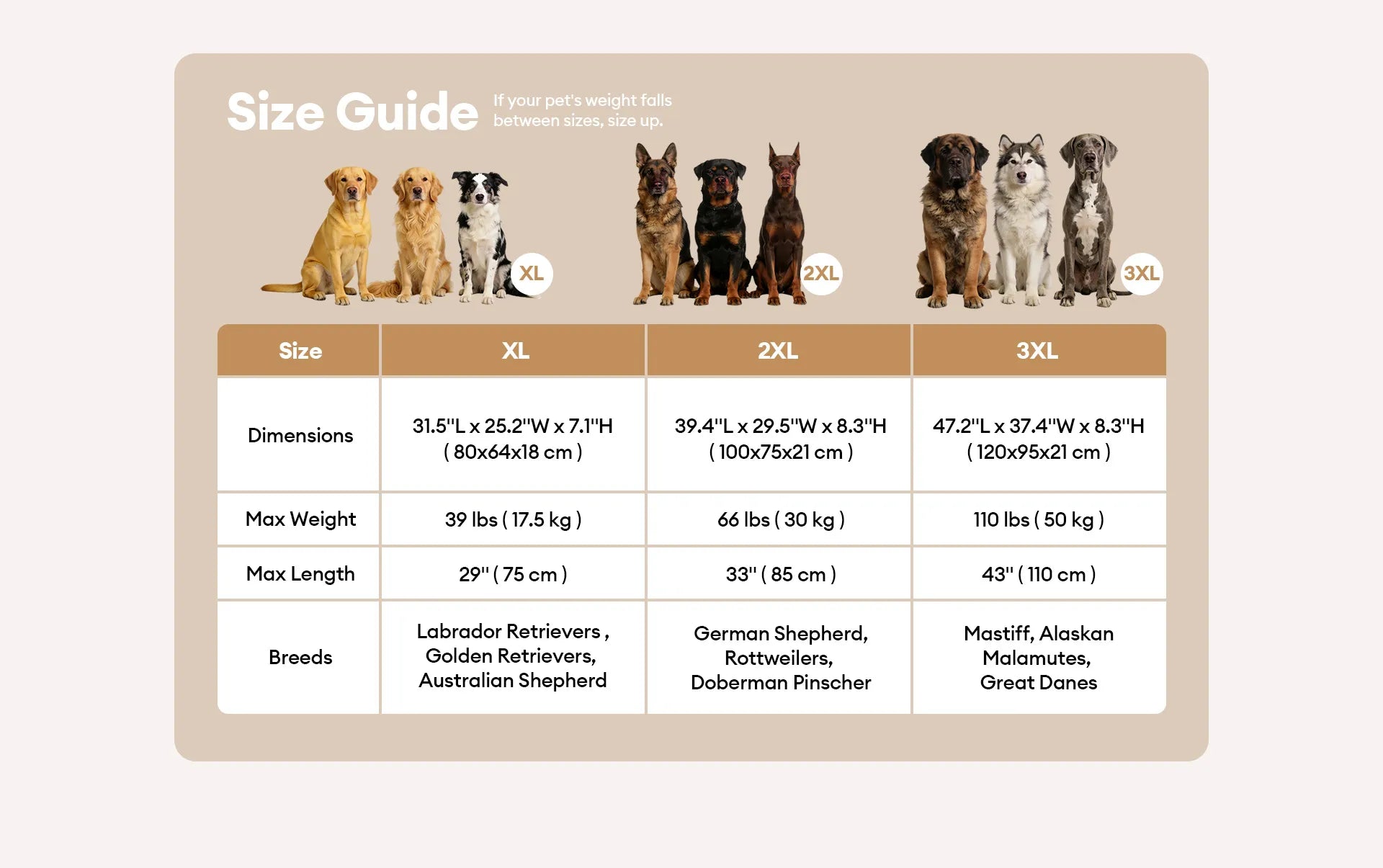 Unser Bett ist in großen Größen erhältlich und bietet für Hunde aller Gewichtsklassen und Größen ausreichend Platz zum Ausstrecken und Entspannen.