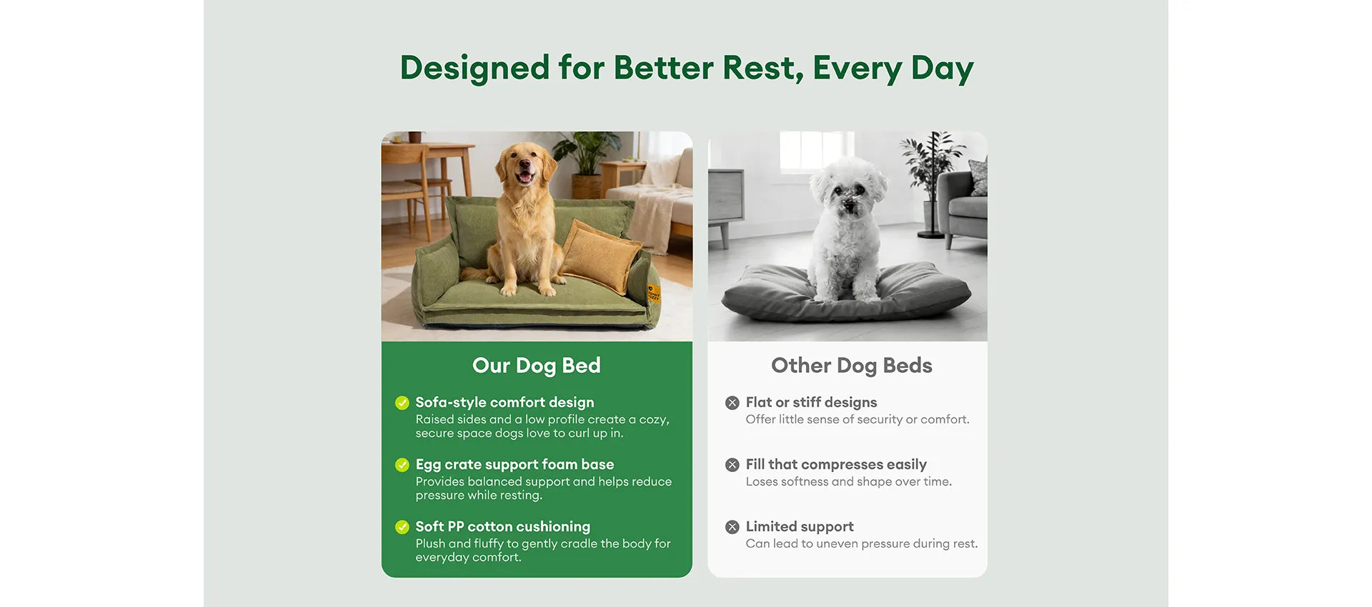 Headrest Bolsters & Matching Pillow: Raised bolster sides and a detachable pillow provide head and neck support, giving your pet a secure and restful spot to lean into.