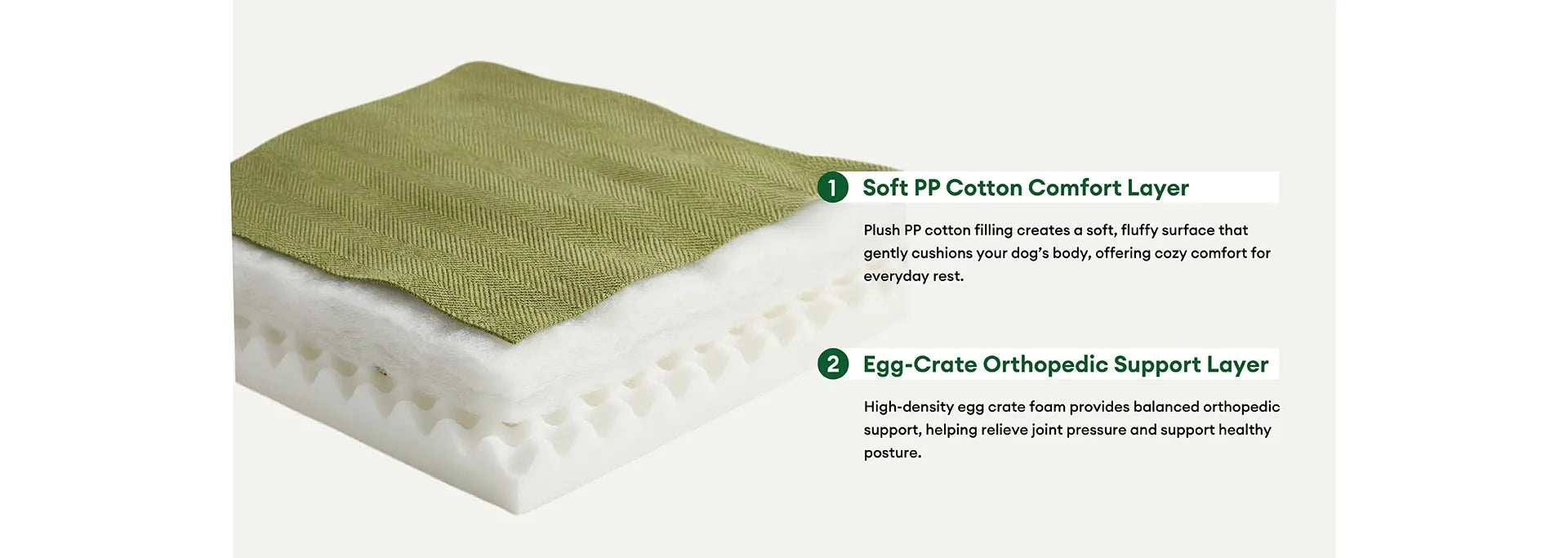 Dual-layer Orthopedic Support: Engineered with a dual-layer filling of egg-crate sponge and dense PP cotton, this bed cushions joints and muscles for superior orthopedic support—ideal for senior pets, small breeds, or those recovering from injury.