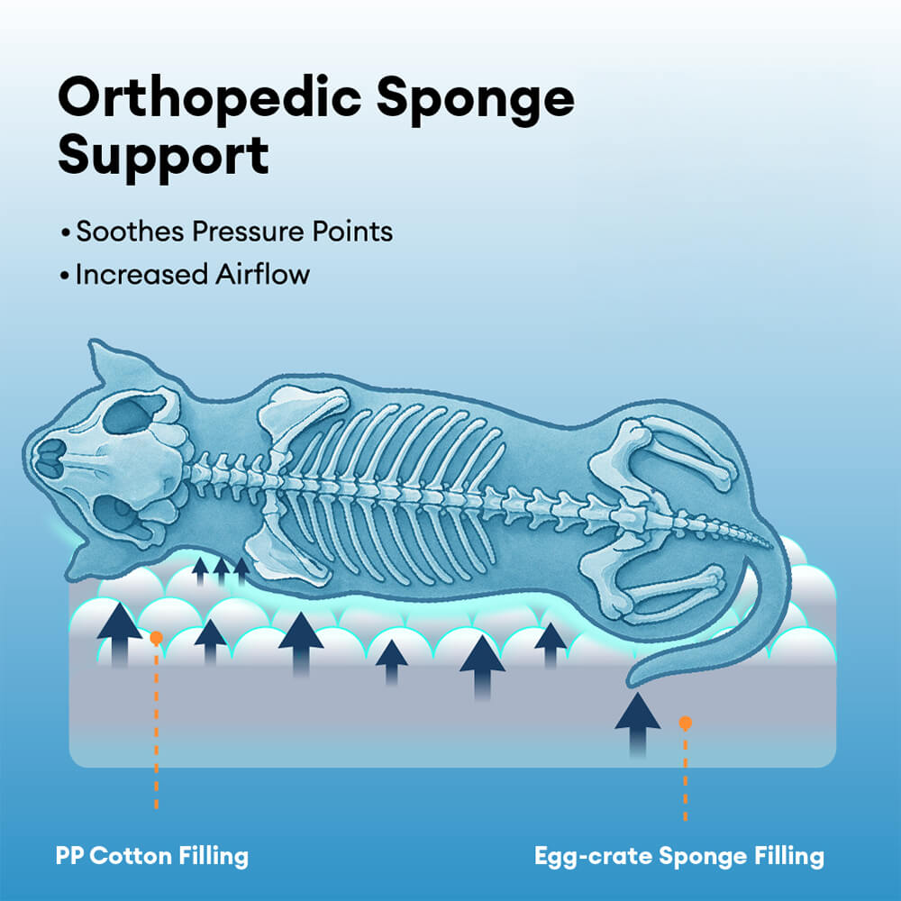 - Articulación &Soporte para la columna vertebral: Diseñado con espuma de alta densidad tipo caja de huevos para distribuir el peso de manera uniforme, aliviar los puntos de presión y sostener las caderas y la columna, especialmente beneficioso para perros mayores o razas propensas a problemas en las articulaciones.