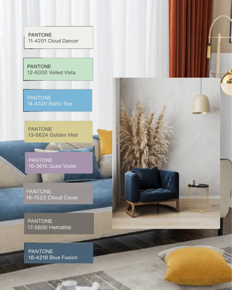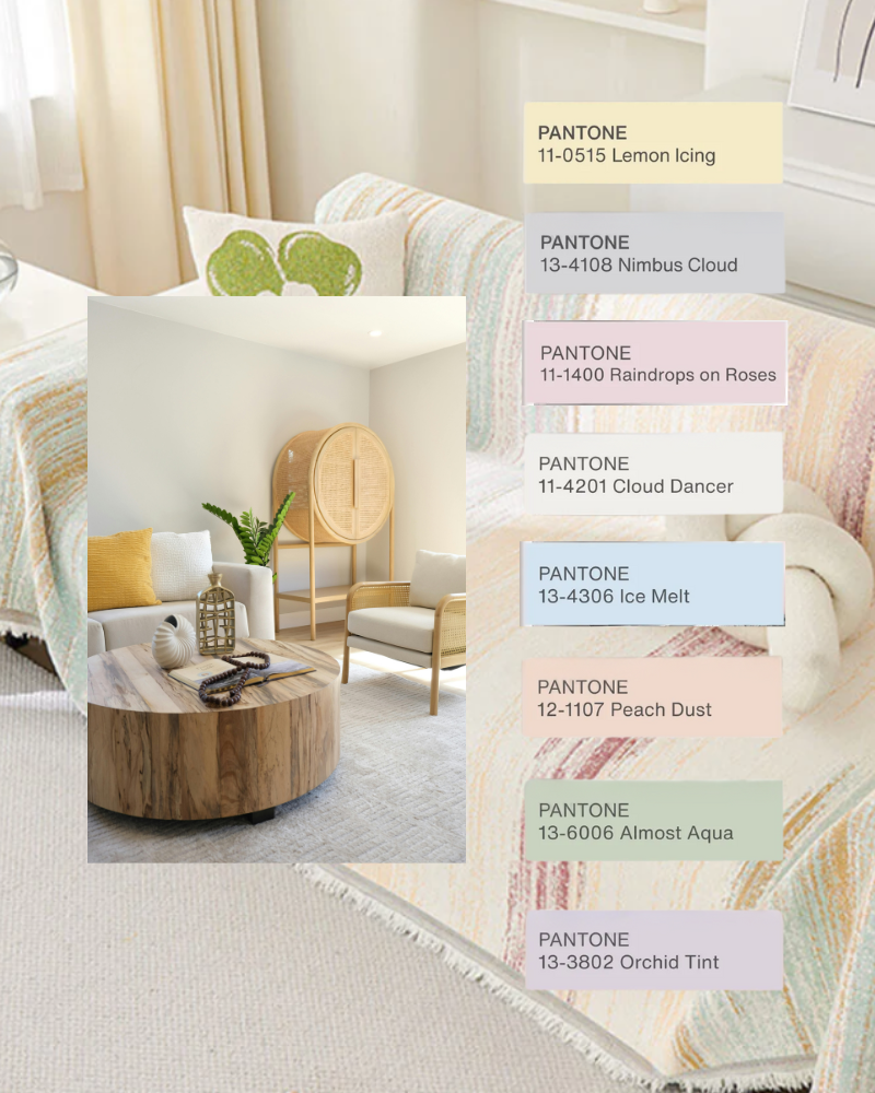 Pastel and neutral tones make compatible combinations to Cloud Dancer, offering subtle shifts in hue that are nuanced, pleasing, and understated.