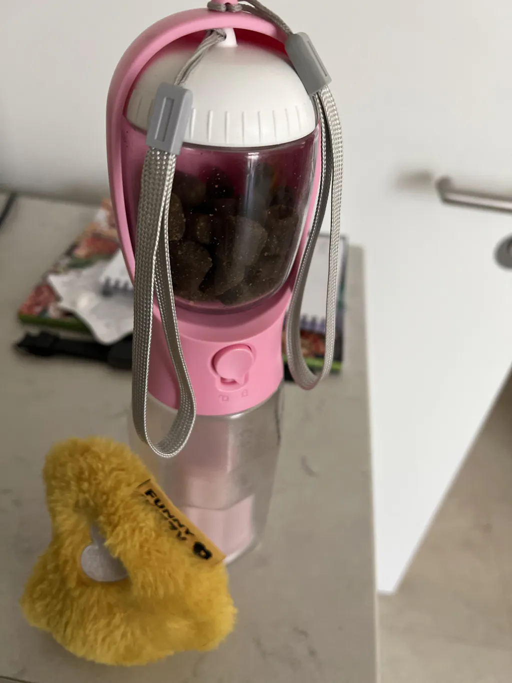 - 3 in 1 Multifunctional Design: This bottle is a combination of water bottle, food container and poop bags. It could hold 600ml water and 3.5 ounce (100g) food, which is totally enough for a walking and short trips. This bottle makes you travel with your dogs easier.
