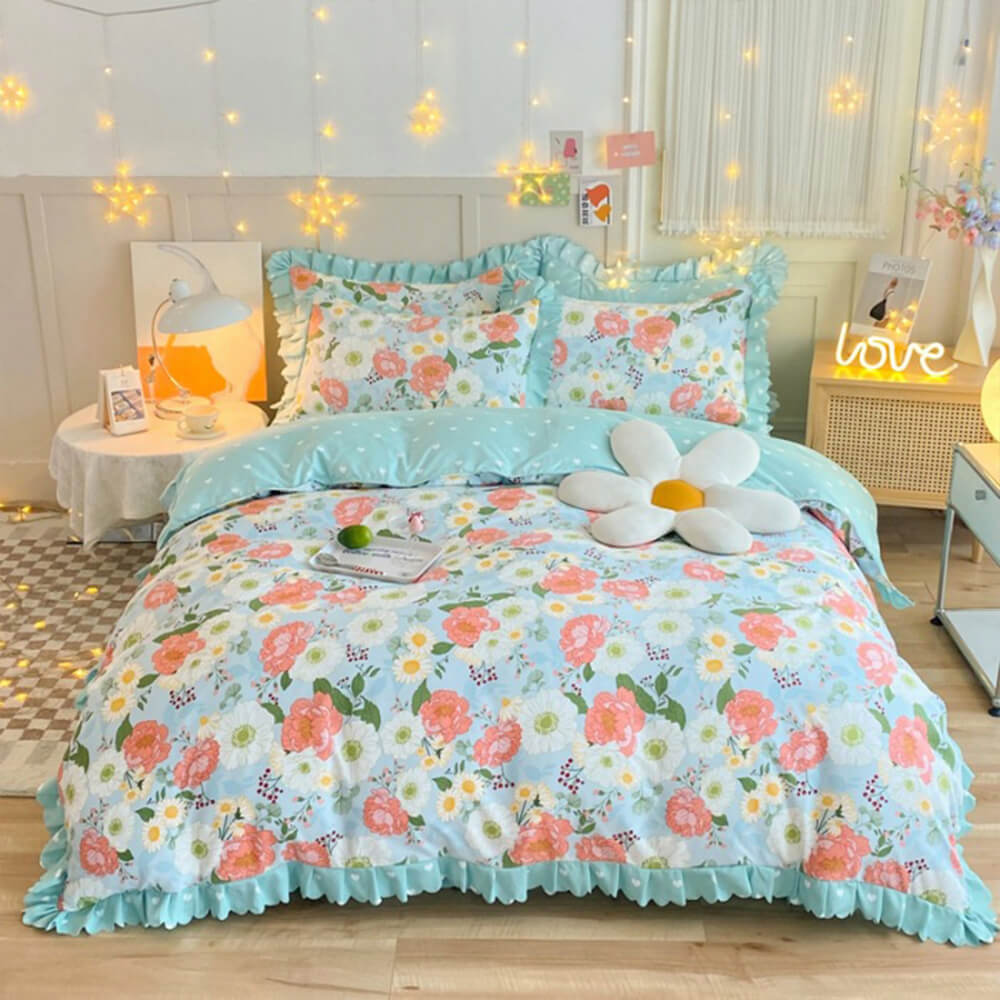 - Romantic ruffled Decoration: Adding a touch of romance, the lace trim along the edges of the bed skirt and pillowcases creates an elegant and delicate look.